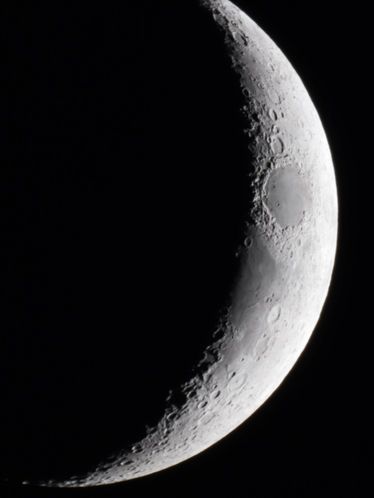 6’th of March 2022 and a clear night at last for a crescent Moon. For this shot I used a Canon EOS 800D attached to the Meade ETX. There was a lot of atmospheric turbulence at high magnification but a fair bit of detail nonetheless.